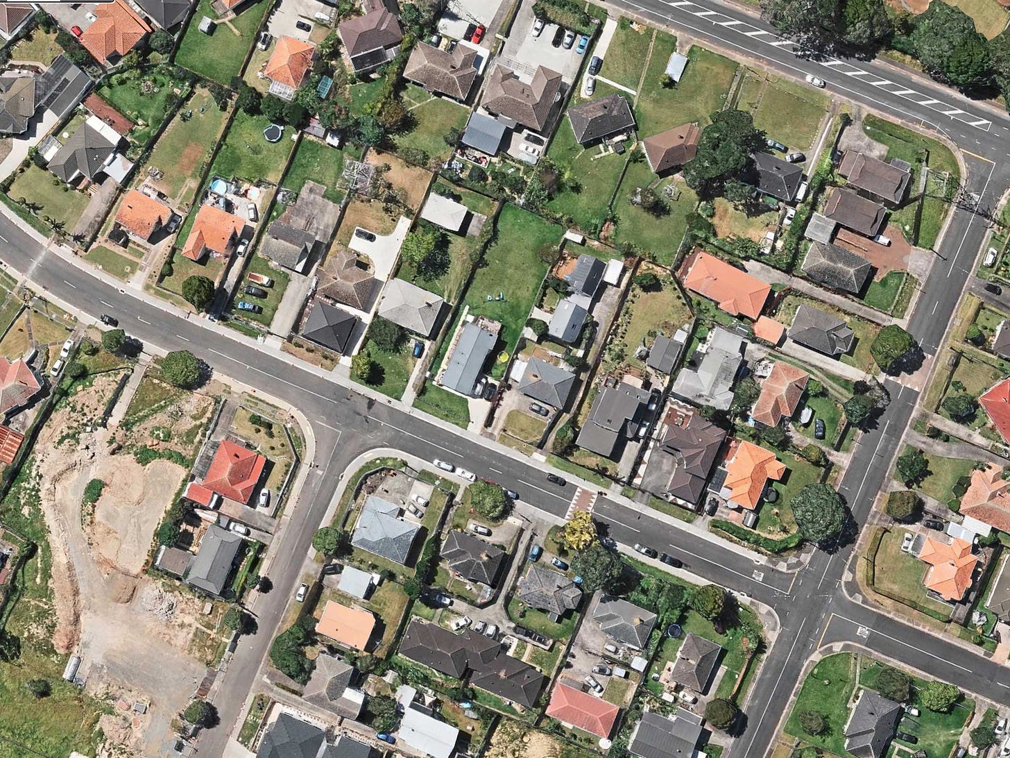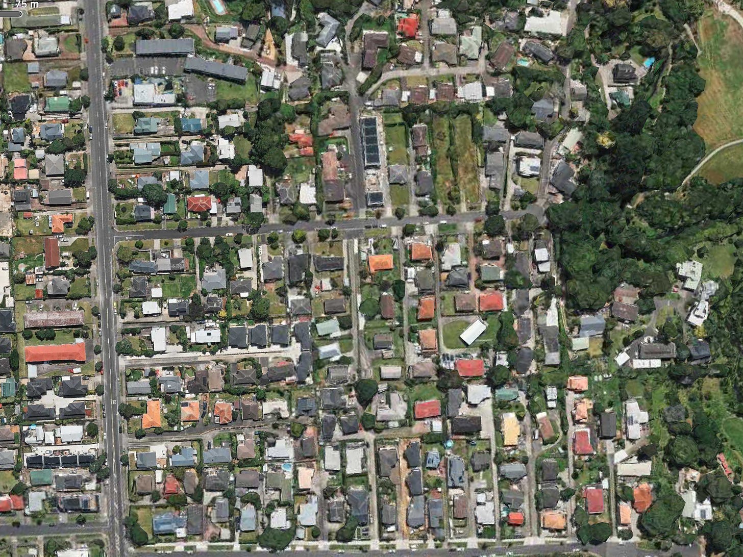 Of just as much importance is the analysis of the damage done in both events and why it occurred. The media attributed the events to climate change even though, as Ian Wishart demonstrated, events such as Cyclone Gabrielle are not unusual. The flooding in Auckland was perhaps unusual but despite the several reasons extended in the media—a climate-change engendered rain event, inadequate drainage infrastructure, poorly chosen development sites—I saw no mention of the change in land use over the century and a half or more Auckland has developed. When Europeans first settled those parts, West and South Auckland could be described as open savannah—light scrub-covered ground which was well drained. It would have experienced few problems in draining the effluent from severe rain events. The situation is very different now. The majority of the area is impermeable—roads, rooves, and pathways meaning that water accumulates as it drains away from rain events and cannot easily escape, possibly having to do so through inadequate drainage infrastructure. My knowledge of some of the areas dates from my early teens more than 70 years ago when I used to ride a bicycle through the regions to visit relatives who lived in a newly developed area in Mt Roskill which, as this picture shows (Apple Maps), has changed since then. While some houses remain on their original allotments
