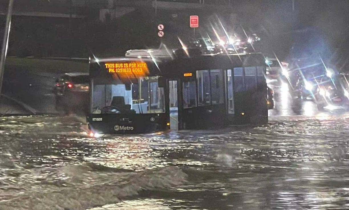The extent to which the drainage system around Auckland was unable to cope is demonstrated by this photograph of a stranded bus.