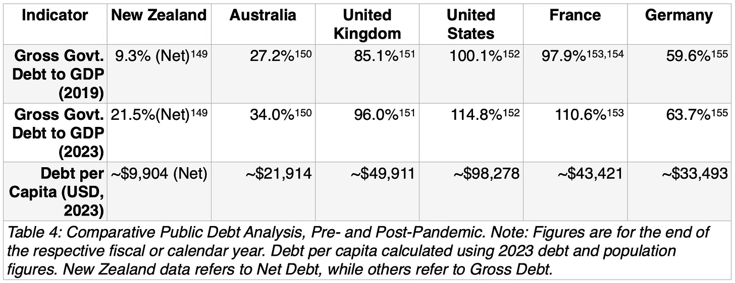 Table 4 provides a comparative snapshot of the fiscal impact on New Zealand and the other nations in this analysis, highlighting the change in debt-to-GDP ratios and the resulting debt burden per citizen.