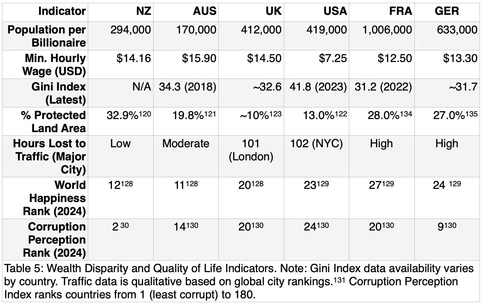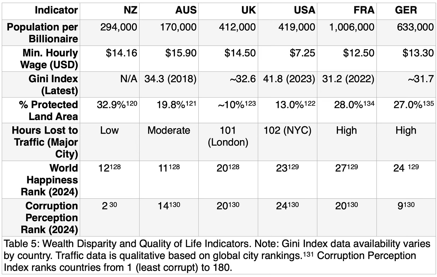 However, this idyllic image is complicated by a notable level of wealth inequality. The concentration of billionaires relative to the population is high, and the share of wealth held by the top decile is substantial98,99. This suggests that the economic benefits of New Zealand‘s model are not distributed as evenly as its lifestyle advantages, creating a society that is simultaneously liveable but highly stratified.
