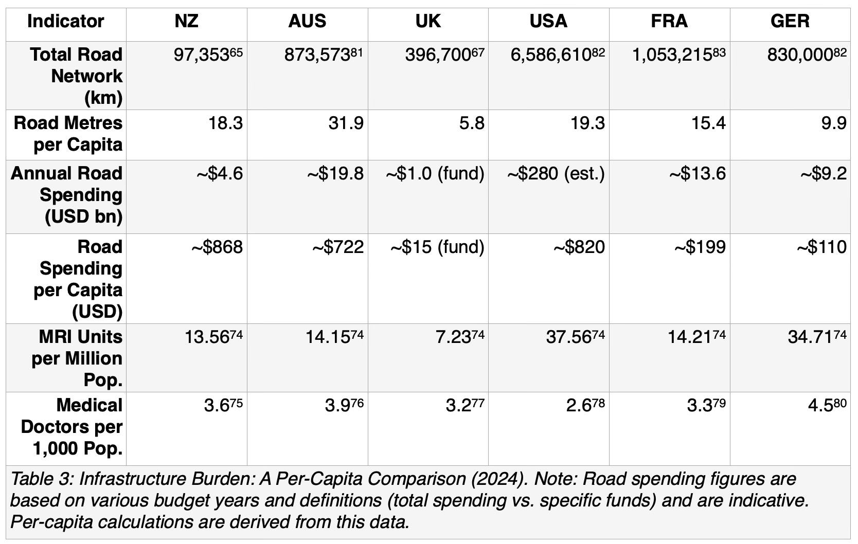 This fiscal pressure necessitates strategic compromises in the provision of capital-intensive public services like healthcare. An analysis of specialised medical infrastructure reveals that New Zealand often occupies a middle ground, unable to afford the density of the wealthiest large nations but maintaining a standard above others. For example consider Magnetic Resonance Imaging (MRI) machines per million people. New Zealand with 13.56 is well behind the capital-rich systems of Germany (34.71) and the USA (37.56)74, but is nearly double the capacity of England (7.23). A similar pattern exists for the density of medical doctors. With 3.6 doctors per 1,000 people, New Zealand is better staffed than the UK (3.2) and the USA (2.6) but has fewer physicians per capita than Germany (4.5) and Australia (3.9)75,76,77,78,79.