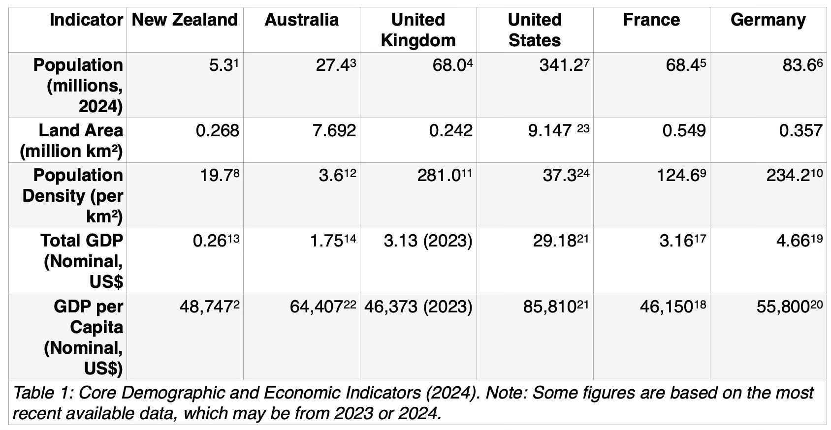 Note that the figures researched in this report pre-date the recent uncertainty in international tariffs or the present government policies.Any meaningful analysis of a nation‘s economic and social characteristics must begin with an understanding of its fundamental scale. For New Zealand, this consideration is important. Compared to major developed nations, New Zealand operates with a different demography and economy—not just as a matter of degree but rather of orders of magnitude which creates a gulf between its unique advantages and its structural, economic challenges.